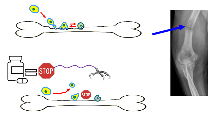 We are examining the role of cancer cell motility after cells have already moved to bone. We have synthesized a novel therapeutic that binds bone, inhibits cell movement, and demonstrated that it potently inhibits cancer from destroying bone. This is a major problem for patients with prostate, breast, lung, and other cancers. (BioRxiv 2025)